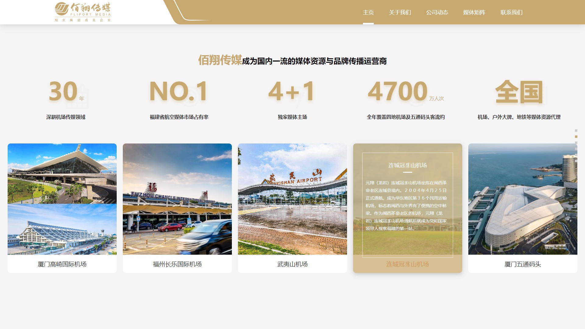 福建佰翔传媒有限公司成立于1995年,是隶属于中国服务业500强企业厦门翔业集团的专业化媒体运营公司。佰翔传媒拥有厦门高崎国际机场、福州长乐国际机场、武夷山机场、连城冠豸山机场及厦门五通客运码头等核心交通枢纽的独家广告经营权。同时致力于通过媒体整合、创意策划为客户创造最有价值的品牌传播服务,从品牌、媒体、流量多维度出发,通过线上线下平台整合营销,创造注意力叠加价值,是福建省内规模最大和最具影响力的户外广告公司之一。